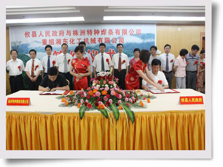 2011年6月2日,湘化機迎來了歷史性的一天。全體職工期盼已久的重組歷經七年,終于在今天取得成功。株洲特種焊條有限公司在與攸縣人民政府多次磋商后,正式簽訂了重組湘化機的協議。 簽約儀式上,株洲特種焊條有限公司總經理曾繼疆首先發言,對來到攸縣感到榮幸,表達了重組湘化機的決心和信心,表示將盡快把湘化機帶出困境,并為攸縣經濟發展作出自己的貢獻;湘化機董事長兼總經理蘇成隨后表態:公司領導班子和全體職工將以更飽滿的熱情、更努力的工作,把湘化機做大做強,爭創化機行業一流,帶動攸縣縣域經濟的發展;攸縣縣委書記鄺鄒飛最后發言,對曾總重組湘化機表示了感謝和敬意,并請曾總能集中精力和財力,按照“三年五個億,五年十個億”的目標,把湘化機迅速做大做強。同時,要求攸縣各相關部門對于湘化機下一步的工作必須不遺余力地予以支持,優化企業發展環境,共同把湘化機打造成全國一流的化工裝備制造企業。 重組之后,制約公司發展的資金問題將會徹底解決,正是大展拳腳的機會,各項工作將緊張有序地全面展開。全體職工要改變精神面貌、轉變觀念,一切以效率為先,齊心協力,再創湘化機的輝煌。