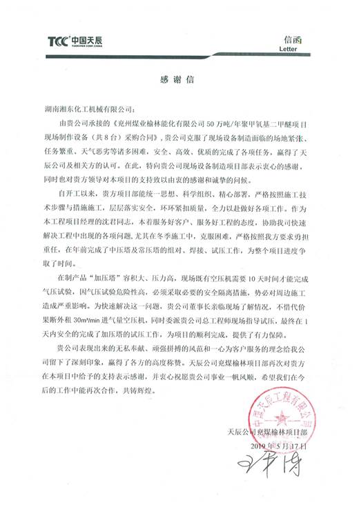 近日,我公司收到中國天辰有限公司兗煤榆林項目部感謝信,天辰公司為我公司提前圓滿完成榆林項目而表示感謝,全文如下: